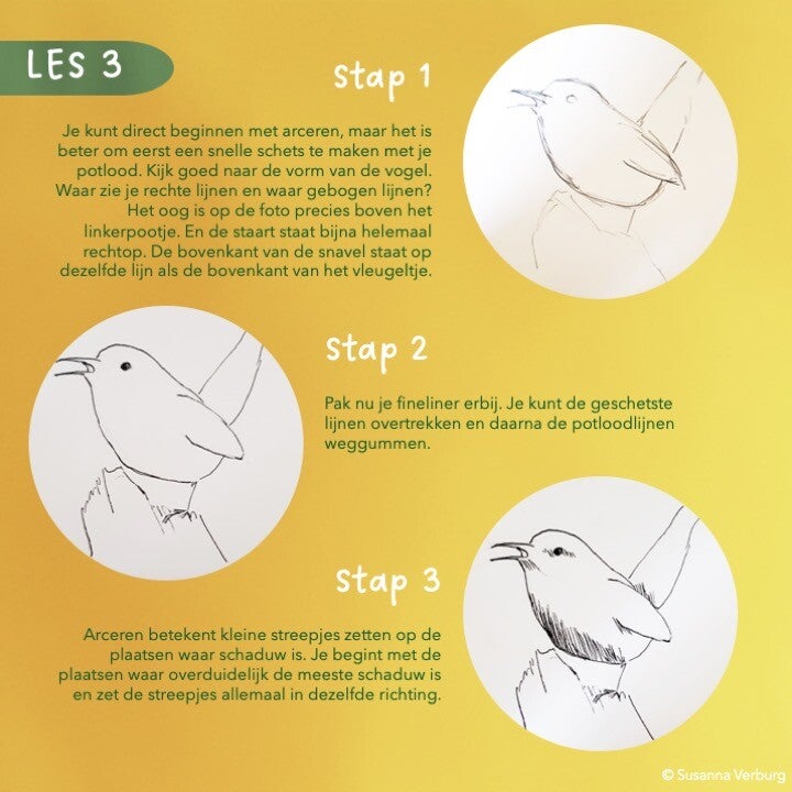 Deze cursus heeft twee doelen. Ten eerste om jou te leren hoe je beter en realistischer kunt tekenen of schilderen. Ten tweede om jou creativiteit te stimuleren. Tijdens elke les krijg je stap-voor-stapinstructies waarmee je iets belangrijks leert. Daarna geef ik je meer vrijheid in een opdracht. Dan wil ik dat je het geleerde toepast en gebruik maakt van jóu creativiteit.